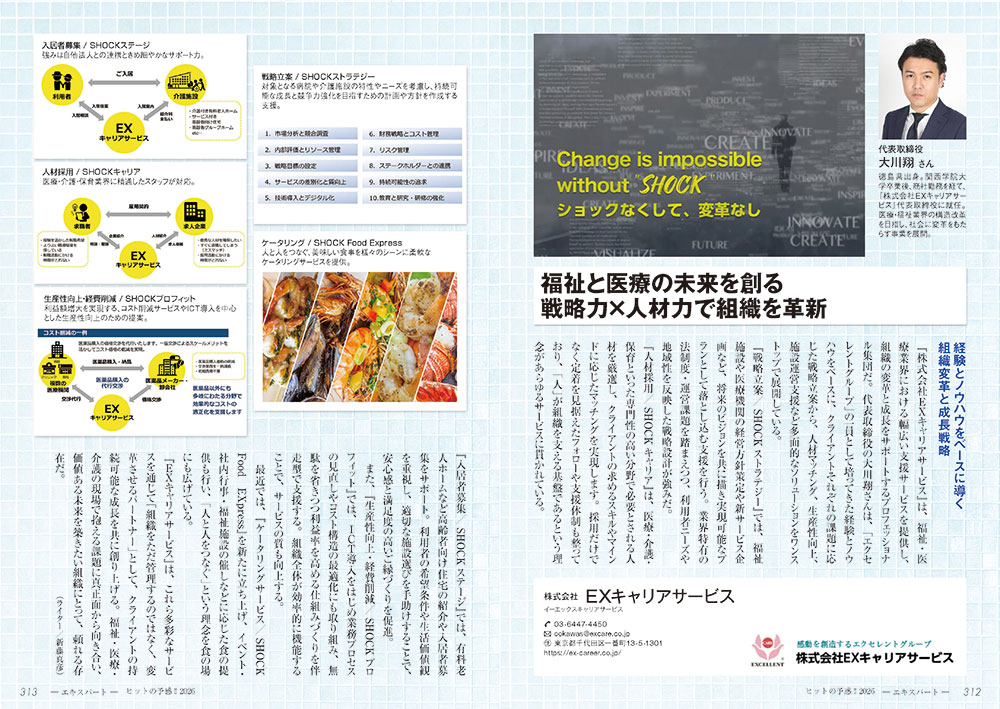 2026年の大注目の商品・サービス・人物を紹介する『2026年度版ヒットの予感!!』にて、弊社が掲載されました。 「福祉と医療の未来を創る 戦略力×人材力で組織を革新」として、弊社が展開する福祉・医療業界に向けた幅広い支援サービスをご紹介いただきました。 同書籍は2025年11月7日(金)より書店やネット通販にて発売開始となります。 お手元にとる機会がございましたら、ぜひご覧ください。 ※弊社紹介ページのみ、下記の画像をクリックするとご覧いただけます(クリックするとPDFが開きます)